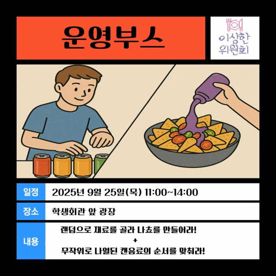 본문 시작 홈으로 공지사항 학생위원회 개요 학생위원회 소개 공지사항 활동결과 홈페이지가이드 프로그램 계획 프로그램 계획 세명대학교 공지사항 프로그램 계획 페이스북 트위터 프린트 [이상한 위원회] 유쾌하거나 불쾌하거나 학생처 532 2025-09-25 안녕하세요 🍽 이상한 위원회 🍽 입니다 청룡체전 기간 중 이상한 위원회에서 나쵸 만들기와 캔 위치 맞히기 게임을 진행하는 홍보 부스를 운영합니다! 🍭 이상한 위원회 인스타도 팔로우 하고 재미있는 경험하고 가세요🤗 ✅ 선착순 150명 ✅ 일시: 2025. 9. 25.(목) ✅ 시간: 11시~14시 ✅ 장소: 학생회관 앞 광장 많은 참여와 관심 부탁드립니다❤ 목록 이전[용감한 창업자] 어떤 향이 좋아? 이전[밀어주는 위원회] 너의 꿈, 우리가 밀어줄게! 담당부서 : 장학복지팀 담당자 : - 연락처 : 043-649-1142 최종수정일 : 2024-10-26 만족도조사 만족도 조사 이 페이지에서 제공하는 정보에 대하여 만족하시나요? 매우만족 만족 보통 불만족 매우불만족
