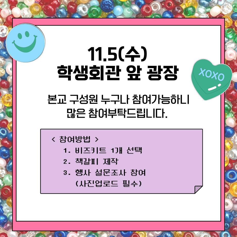 본문 시작 홈으로 공지사항 학생위원회 개요 학생위원회 소개 공지사항 활동결과 홈페이지가이드 프로그램 계획 프로그램 계획 세명대학교 공지사항 프로그램 계획 페이스북 트위터 프린트 [꽃피는 위원회] 북!마크!해버렸지뭐야 학생처 323 2025-11-05 꽃피는 위원회의 <비즈 책갈피 만들기> 행사명: 북!마크!해버렸지뭐야 행사일: 2025.11.05(수) 12시~15시 장 소: 학생회관 앞 광장 참여대상: 본교 구성원 선착순 100명 한정 많은 참여 부탁드립니다. 목록 이전[착한 위원회] 약과하나 주면 안잡아 먹지 다음 [맛있는 위원회] 얼죽아 모임에 초대합니다 담당부서 : 장학복지팀 담당자 : - 연락처 : 043-649-1142 최종수정일 : 2024-10-26 만족도조사 만족도 조사 이 페이지에서 제공하는 정보에 대하여 만족하시나요? 매우만족 만족 보통 불만족 매우불만족