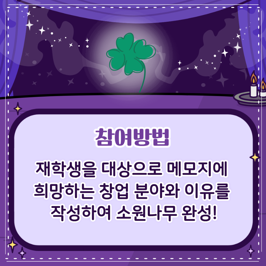본문 시작 홈으로 공지사항 학생위원회 개요 학생위원회 소개 공지사항 활동결과 홈페이지가이드 프로그램 계획 프로그램 계획 세명대학교 공지사항 프로그램 계획 페이스북 트위터 프린트 [용감한 위원회] 창업? 다 이루어질지니~ 취창업지원처 383 2025-11-05 [용감한 위원회] 창업? 다 이루어질지니~ 📍[용감한 위원회] 창업? 다 이루어질지니~📍 1. 운영일자: 2025. 11. 5.(수) 12:00 ~ 15:00 2. 운영장소: 학생회관 앞 광장 3. 운영방법: 내가 만약 창업을 한다면? 희망하는 창업분야와 이유를 나뭇잎 메모지에 적은 후, 폼보드에 붙여 소원나무를 완성해 주세요! 4. 운영대상: 재학생 및 교직원 즐겁고 재미있는 활동을 할 예정이니, 많은 관심과 참여 부탁드립니다!! 💗💗 목록 이전[건강한 위원회] 보틀크래시 다음 [착한 위원회] 나만의 키 입력 중 담당부서 : 장학복지팀 담당자 : - 연락처 : 043-649-1142 최종수정일 : 2024-10-26 만족도조사 만족도 조사 이 페이지에서 제공하는 정보에 대하여 만족하시나요? 매우만족 만족 보통 불만족 매우불만족