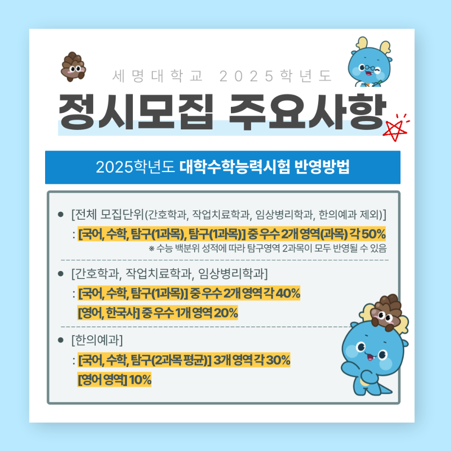 본문 시작 홈으로 커뮤니티 학과소개 교수소개 교육과정 커뮤니티 홈페이지가이드 포토갤러리 학과공지 학사일정 채용정보 및 자료 학생회 포토갤러리 포토갤러리 페이스북 트위터 프린트 세명대학교 2025학년도 정시모집 주요사항 안내 재난안전학과 2770 2024-12-30 세명대학교 2025학년도 정시모집 주요사항 안내 목록 이전세명대학교 재난안전학과 2025학년도 수시모집 충원 합격자 안내 다음 학생들의 통학은 세명대가 책임진다 만족도조사 만족도 조사 이 페이지에서 제공하는 정보에 대하여 만족하시나요? 매우만족 만족 보통 불만족 매우불만족