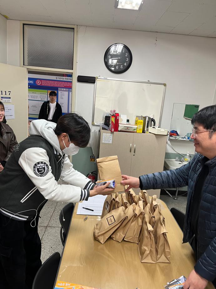 본문 시작 홈으로 커뮤니티 학과소개 교수소개 교육과정 커뮤니티 홈페이지가이드 포토갤러리 학과공지 학사일정 채용정보 및 자료 학생회 포토갤러리 포토갤러리 페이스북 트위터 프린트 책임지도교수 지도비 세네뜨리 빵 나눔 행사 진행 재난안전학과 115 2026-03-26 2026년 3월 26일(목) 오후 12시에 학과사무실(이공학관 117호)에서 작년 학기와 같이 세네뜨리아 빵(올리브롤치즈브레드+브라우니) 나눔 행사를 진행하였습니다. 재난안전학과 재학생들과 학과 교수님들간의 유대감을 형성하는 계기가 되었습니다. 목록 이전재난안전_3월 뉴스 만족도조사 만족도 조사 이 페이지에서 제공하는 정보에 대하여 만족하시나요? 매우만족 만족 보통 불만족 매우불만족