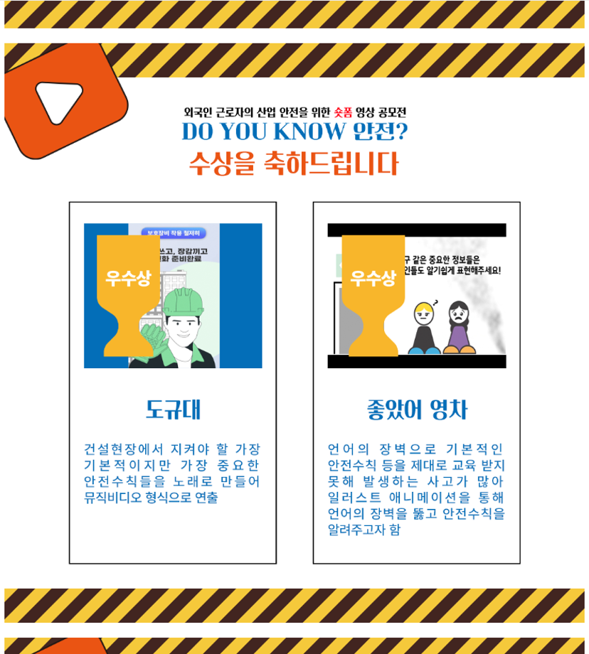 본문 시작 홈으로 학과자랑 학과소개 학과과정 시영소식 입학/취업 AI 학과자랑 SNS소통 홈페이지가이드 학과자랑 학과자랑 갤러리 공모전 동아리 졸업전시회 학과자랑 페이스북 트위터 프린트 외국인 근로자를 위한 숏폼 영상 공모전 - DO YOU KNOW 안전? 시각영상디자인학과 1816 2024-09-08 2학년 심*호/방*림팀(좋았어 영차)이 우수상을 수상하엿습니다~ 축하합니다~ 외국인 근로자의 산업안전을 위한 숏폼 영상 공모전 (safetycon.kr) [본선진출후보작] 꼭 알아둬요! 산업 안전 수칙! (youtube.com) 목록 이전2024학년도 1학기 총장표창 (시각영상디자인학과 3명 수상) 다음 졸업생 인터뷰 - 20학번 졸업생 이*현 담당부서 : 시각영상디자인학과 담당자 : - 연락처 : 043-649-1726 최종수정일 : 2024-10-26 만족도조사 만족도 조사 이 페이지에서 제공하는 정보에 대하여 만족하시나요? 매우만족 만족 보통 불만족 매우불만족
