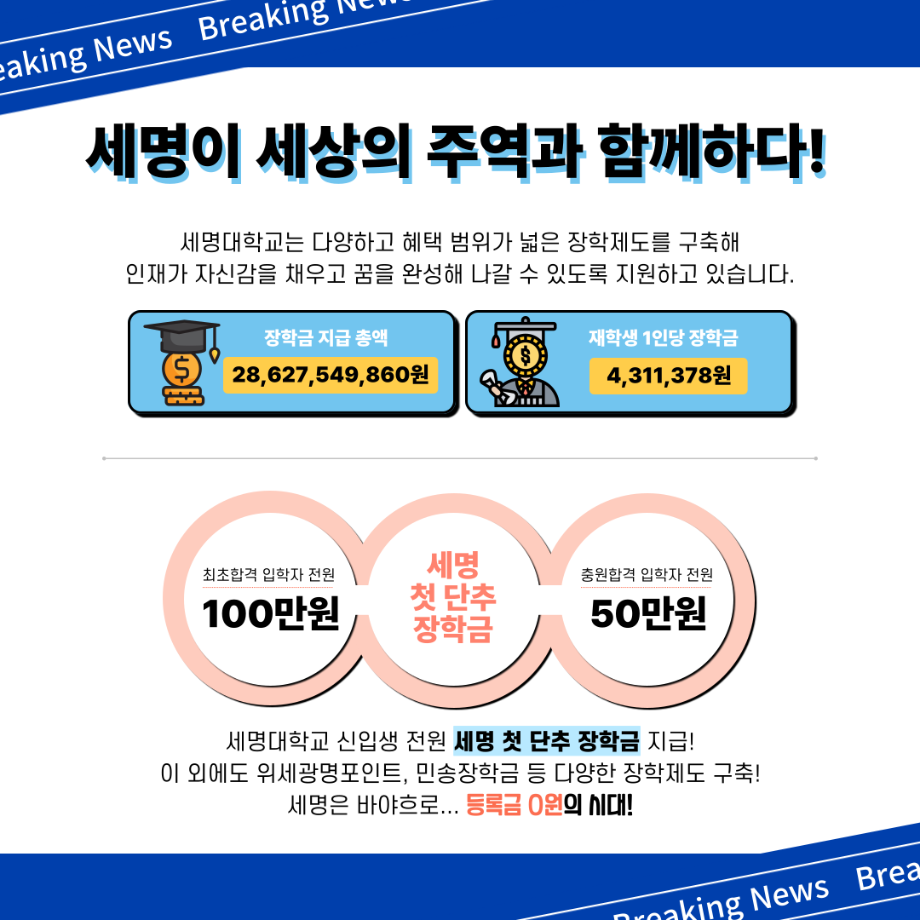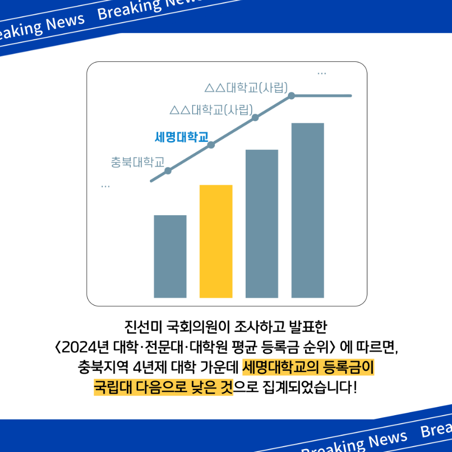 본문 시작 홈으로 MCC News 학과소개 교수소개 학과과정 MCC News MCC SNS 홈페이지가이드 미디어 정보통 학과 및 재학생 교수 및 졸업생 미디어 정보통 미디어 정보통 페이스북 트위터 프린트 💵 앗‼️ 세명대학교 등록금, 국립대 등록금 만큼 싸다?! 😮 미디어콘텐츠창작학과 3375 2024-09-10 진선미 국회의원이 조사하고 발표한 <2024년 대학, 전문대, 대학원 평균 등록금 순위>에 따르면, 충북지역 4년제 대학 가운데 ✨세명대학교의 등록금이 국립대 다음으로 낮은 것✨으로 집계되었습니다!😎 낮은 등록금에 더불어, 다양한 장학제도까지 구축된 세명대! 세명대학교 신입생 전원에게는 🧶세명 첫 단추 장학금🧶까지 지급한다고?! 세명은 바야흐로 등록금 0원의 시대! 장학금도 가득, 재미있는 경험도 가득한 세명대학교에서 만나요! 목록 이전📢 2024학년도 2학기 생활관 입사 일정 및 제출 서류 등록 안내 다음 [한국문학번역원] <2024 디아스포라 문학 예술행사> 개최 안내 담당부서 : 미디어콘텐츠창작학과 담당자 : - 연락처 : 043-649-1741 최종수정일 : 2024-10-26 만족도조사 만족도 조사 이 페이지에서 제공하는 정보에 대하여 만족하시나요? 매우만족 만족 보통 불만족 매우불만족