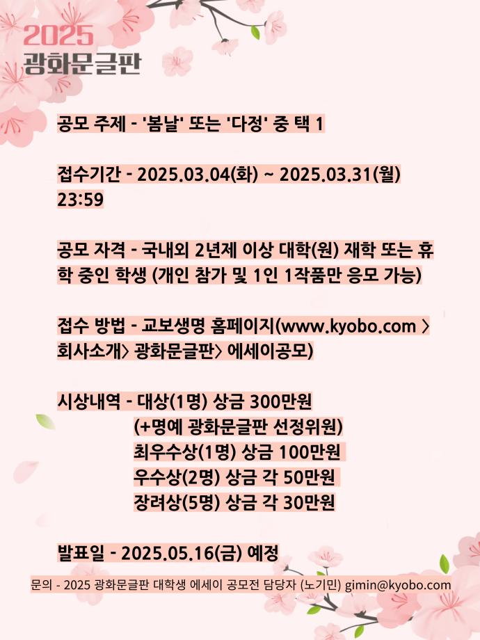 사. 문 의 : 2025 광화문글판 대학생 에세이 공모전 담당자 (노기민, gimin@kyobo.com)