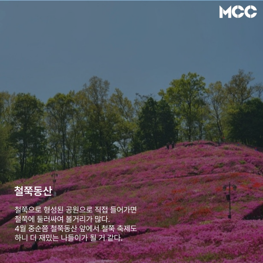 본문 시작 홈으로 MCC News 학과소개 교수소개 학과과정 MCC News MCC SNS 홈페이지가이드 미디어 정보통 학과 및 재학생 교수 및 졸업생 미디어 정보통 미디어 정보통 페이스북 트위터 프린트 💐봄에 나들이 가기 좋은 장소~!🌸 미디어콘텐츠창작학과 1899 2025-04-11 미디어콘텐츠창작학과에서 봄을 맞아 나들이 가기 좋은 장소를 추천해 드립니다. 사랑하는 사람과 함께 나들이 가는 건 어떨까요? 자세한 내용은 미디어콘텐츠창작학과 인스타그램에서 확인해주세요 @smu_mcc 목록 이전제7회 민송백일장 개최 다음 K-REELS 숏폼 컨텐츠 공모전 담당부서 : 미디어콘텐츠창작학과 담당자 : - 연락처 : 043-649-1741 최종수정일 : 2024-10-26 만족도조사 만족도 조사 이 페이지에서 제공하는 정보에 대하여 만족하시나요? 매우만족 만족 보통 불만족 매우불만족