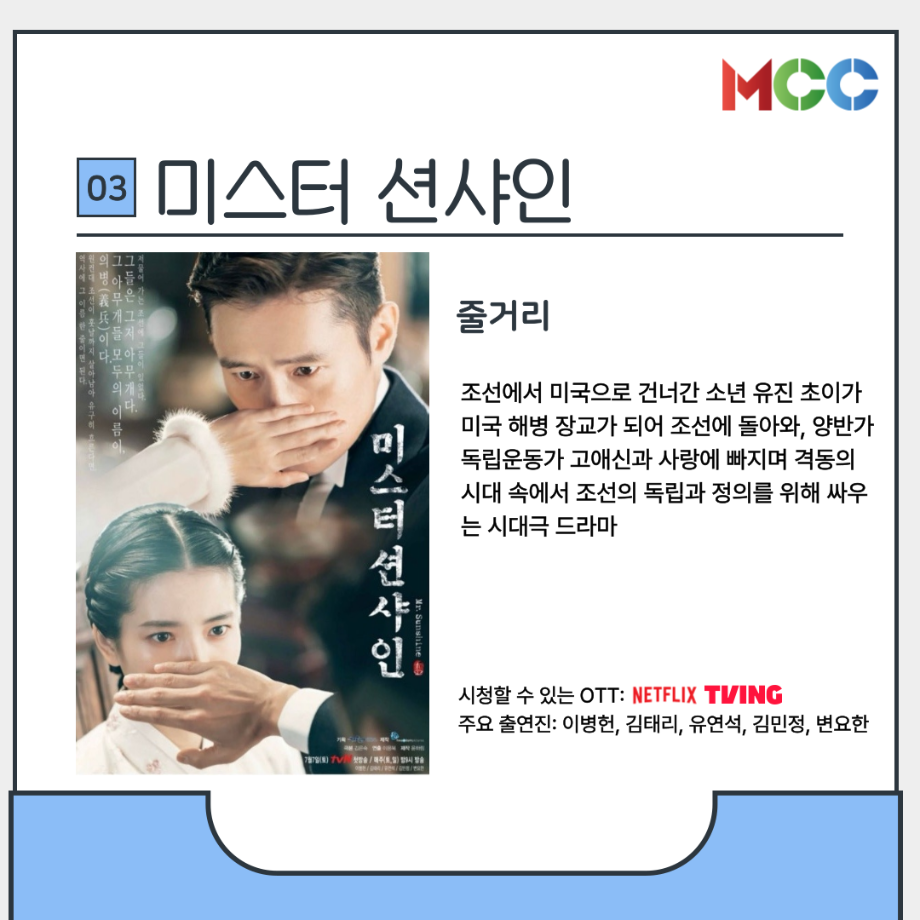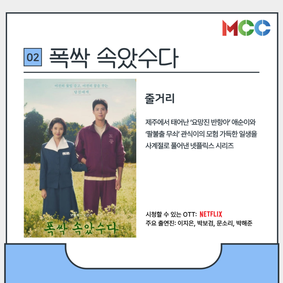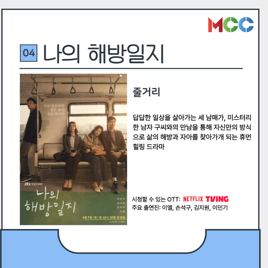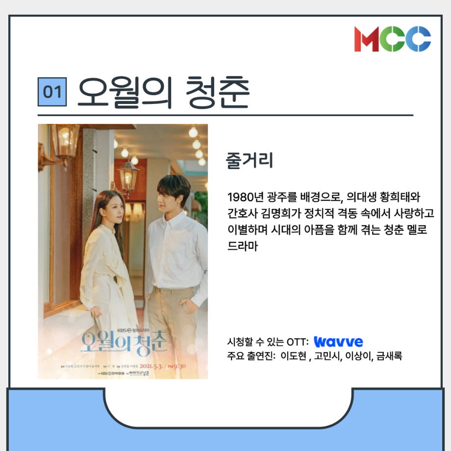 본문 시작 홈으로 MCC News 학과소개 교수소개 학과과정 MCC News MCC SNS 홈페이지가이드 미디어 정보통 학과 및 재학생 교수 및 졸업생 미디어 정보통 미디어 정보통 페이스북 트위터 프린트 힐링이 필요한 미콘창을 위한 드라마 추천 미디어콘텐츠창작학과 1431 2025-05-09 힐링이 필요한 미콘창 학생들이 볼만한 드라마를 추천드립니다 중간고사도 끝났으니 쉬어갈 시간 날씨가 따뜻해지는 요즘 마음이 따듯해지는 드라마 작품을 추천해드립니다 1. 오월의 청춘 2. 폭싹 속았수다 3. 나의 해방일지 4. 미스터 선샤인 5. 그해 우리는 자세한 내용은 미콘창 인스타그램에서 확인해주세요 @smu_mcc 목록 다음 2025 충청북도 60초 영상 공모전 다음 2025년 충북영상자서전 담당부서 : 미디어콘텐츠창작학과 담당자 : - 연락처 : 043-649-1741 최종수정일 : 2024-10-26 만족도조사 만족도 조사 이 페이지에서 제공하는 정보에 대하여 만족하시나요? 매우만족 만족 보통 불만족 매우불만족