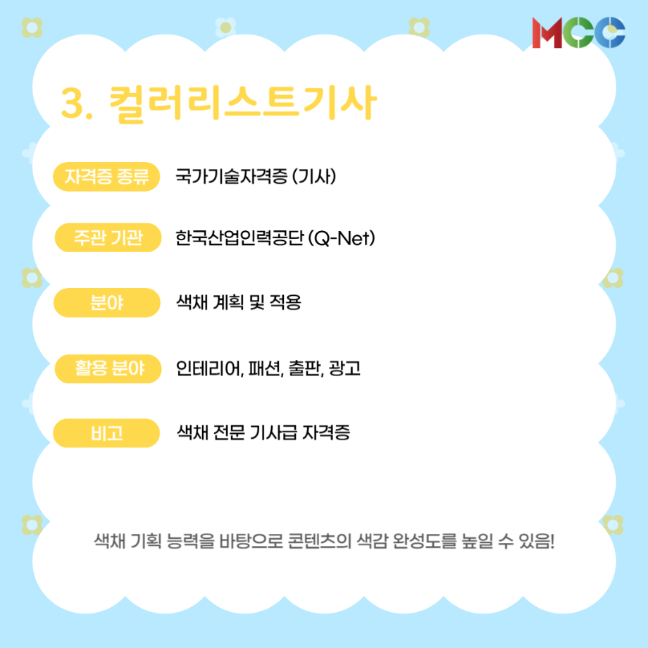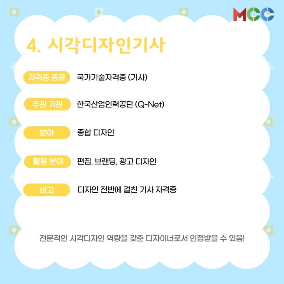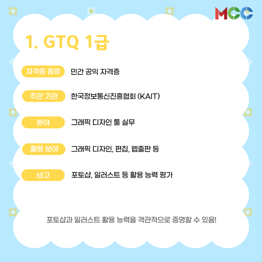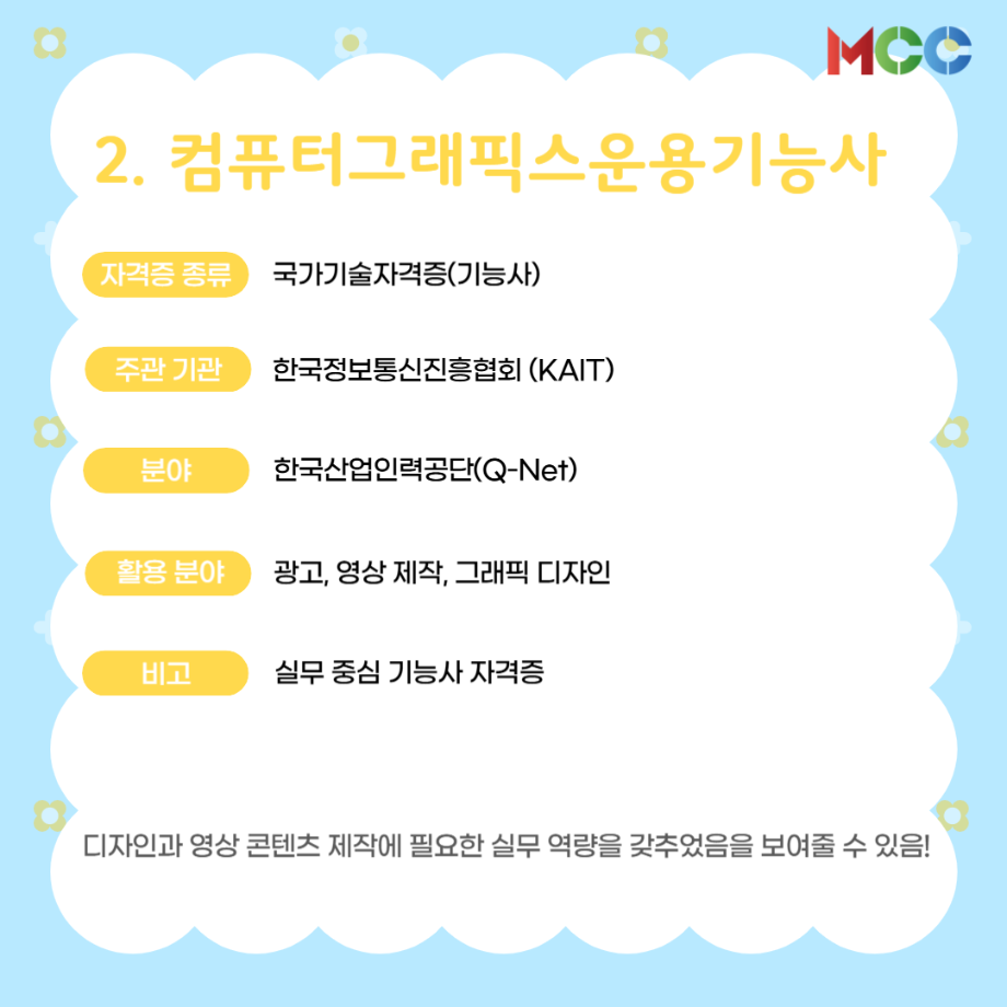 본문 시작 홈으로 MCC News 학과소개 교수소개 학과과정 MCC News MCC SNS 홈페이지가이드 미디어 정보통 학과 및 재학생 교수 및 졸업생 미디어 정보통 미디어 정보통 페이스북 트위터 프린트 미콘창 학생들을 위한 자격증 추천 리스트⭐ 미디어콘텐츠창작학과 1175 2025-06-27 방학 동안 자격증 준비를 해보는 건 어떨까요? 1. GTQ 1급 2. 컴퓨터그래픽스운용기능사 3. 컬러리스트기사 4. 시각디자인기사 5. ACA premiere pro 자세한 내용은 @smu_mcc 인스타그램에서 ! 목록 이전☀️“여름방학에 뭐 하지..?”☀️ 다음 2025 국제평화안보포럼인천 영상 콘텐츠 공모전 담당부서 : 미디어콘텐츠창작학과 담당자 : - 연락처 : 043-649-1741 최종수정일 : 2024-10-26 만족도조사 만족도 조사 이 페이지에서 제공하는 정보에 대하여 만족하시나요? 매우만족 만족 보통 불만족 매우불만족