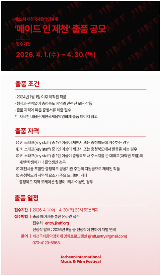 본문 시작 홈으로 학과소식 학과소개 교육과정 학과소식 학과작품 학과SNS 서울대학로 민송아트홀 홈페이지가이드 공모전 공지사항 학과뉴스 공모전 동아리 포토갤러리 공모전 페이스북 트위터 프린트 '메이드 인 제천' 출품 공모 영화웹툰애니메이션학과 7 2026-04-06 목록 이전충북 대학생 문화·관광 홍보영상 제작 공모전 만족도조사 만족도 조사 이 페이지에서 제공하는 정보에 대하여 만족하시나요? 매우만족 만족 보통 불만족 매우불만족