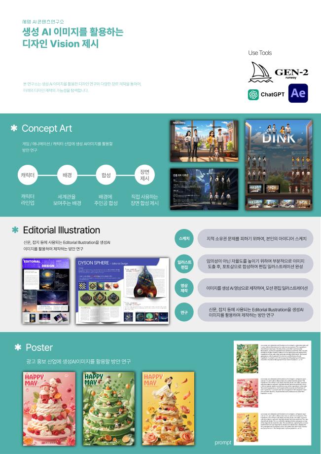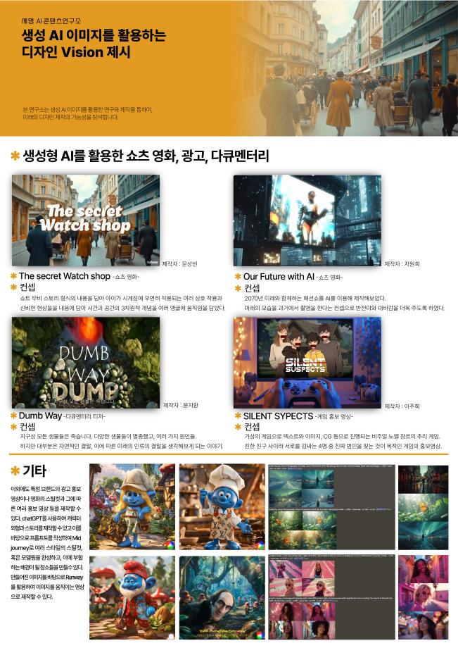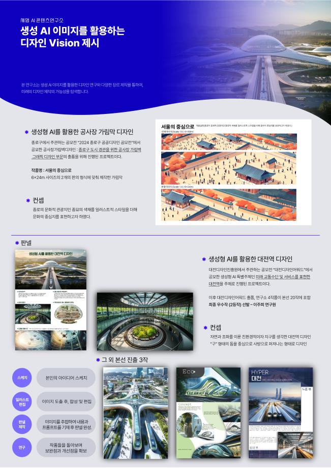 본문 시작 홈으로 AI 학과소개 학과과정 시영소식 입학/취업 AI 학과자랑 SNS소통 홈페이지가이드 AI 콘텐츠 연구소(AI 디자인) 디자인 정보 AI 콘텐츠 연구소(AI 디자인) AI 콘텐츠 연구소(AI 디자인) 페이스북 트위터 프린트 세명 AI 콘텐츠 연구소 - AI art & Design 시각영상디자인학과 841 2025-03-17 세명 AI 콘텐츠 연구소 소속 연구원들이 AI art & Design 전시회를 위해 만든 작업물입니다. 목록 이전세명 AI 콘텐츠 연구소 - 세명 콘텐츠스쿨(SMCS) 가을 정기 전시회 다음 세명 AI 콘텐츠 연구소 - AI art & Design 전시회 만족도조사 만족도 조사 이 페이지에서 제공하는 정보에 대하여 만족하시나요? 매우만족 만족 보통 불만족 매우불만족