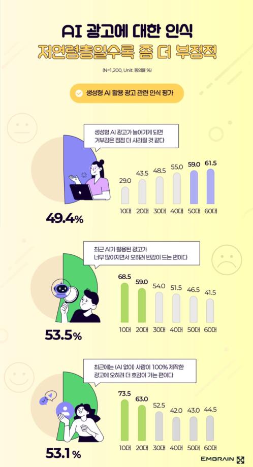 특히 저연령층일수록 AI 광고에 대한 인식이 더 부정적인 것으로 드러났다는 점은 눈여겨봐야 할 부분이다. AI 도구를 가장 적극적으로 활용하는 세대이면서도 기업의 AI 활용에는 비판적인 태도를 보이는 모습이 다소 아이러니하게 느껴지기 때문이다. 이러한 결과에 대해 엠브레인은 젊은 세대일수록 새로운 기술에 대한 기대치가 높은 만큼, 완성도와 진정성 평가 기준도 엄격하게 적용하기 때문이라고 분석했다.