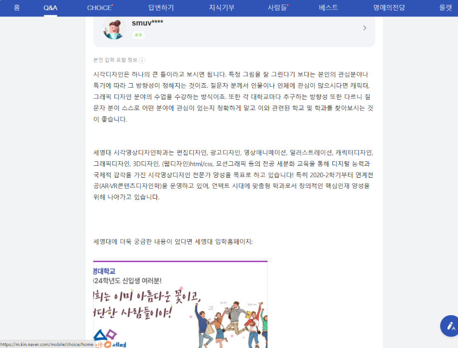 본문 시작 홈으로 입학/취업 학과소개 학과과정 시영소식 입학/취업 AI 학과자랑 SNS소통 홈페이지가이드 입학여기 입학여기 취업지금 전공소개 입학여기 페이스북 트위터 프린트 지식인 학과 답변 ->Q.시각디자인과 배우는것 시각영상디자인학과 1502 2024-08-01 지식인 학과 답변 ->Q.시각디자인과 배우는것 목록 이전예비세명인 입력 페이지 QR코드 다음 2025 수시모집 주요사항 만족도조사 만족도 조사 이 페이지에서 제공하는 정보에 대하여 만족하시나요? 매우만족 만족 보통 불만족 매우불만족
