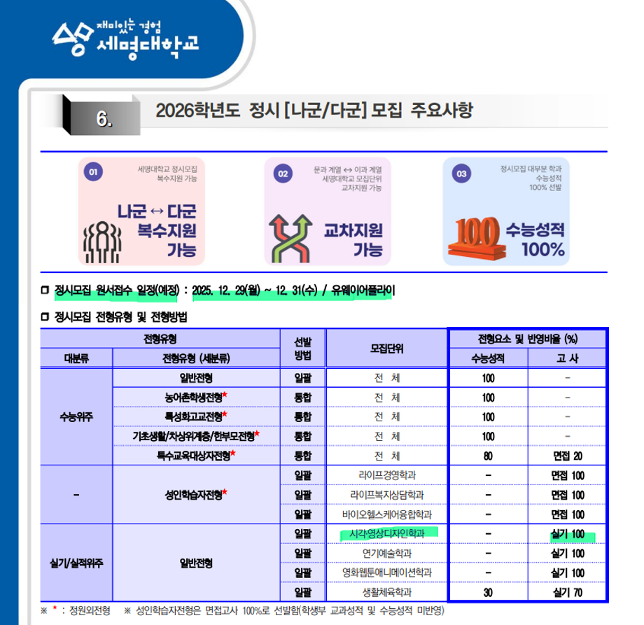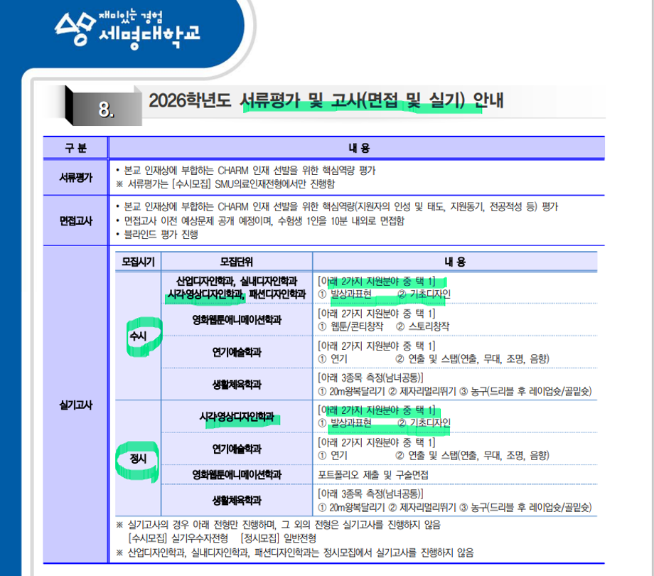본문 시작 홈으로 입학/취업 학과소개 학과과정 시영소식 입학/취업 AI 학과자랑 SNS소통 홈페이지가이드 입학여기 입학여기 취업지금 전공소개 입학여기 페이스북 트위터 프린트 세명대학교_2026학년도 대학입학전형 시각영상디자인학과 2571 2025-03-12 세명대학교_2026학년도 대학입학전형 자세한 내용은 입학본부 공지 참고하세요 https://www.semyung.ac.kr/cop/bbs/BBSMSTR_000000000350/selectBoardArticle.do?nttId=366035&kind=&mno=sitemap_12&pageIndex=1&searchCnd=&searchWrd= 목록 이전2025 신입생 추가 모집 안내 다음 세명대학교_2026학년도 수시모집- 시각영상디자인학과 만족도조사 만족도 조사 이 페이지에서 제공하는 정보에 대하여 만족하시나요? 매우만족 만족 보통 불만족 매우불만족