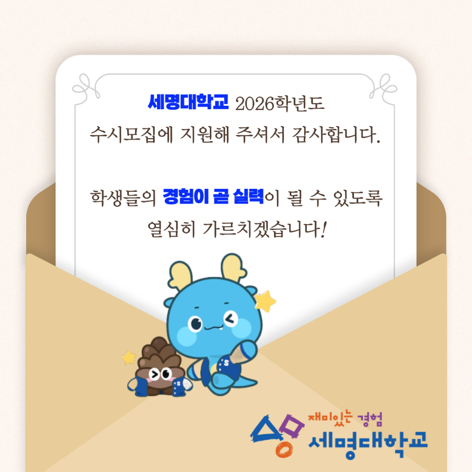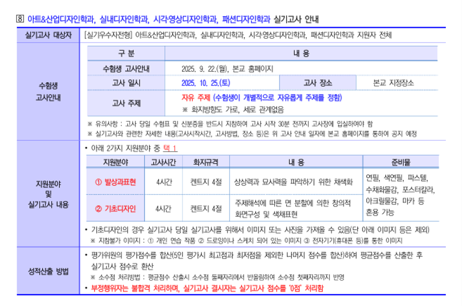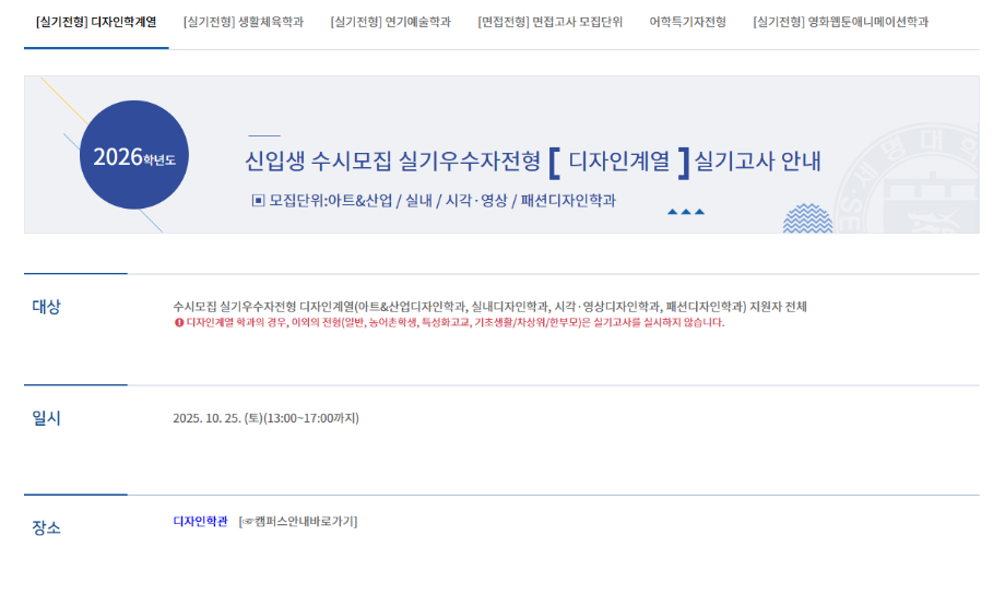 본문 시작 홈으로 입학/취업 학과소개 학과과정 시영소식 입학/취업 AI 학과자랑 SNS소통 홈페이지가이드 입학여기 입학여기 취업지금 전공소개 입학여기 페이스북 트위터 프린트 2026 수시모집 디자인계열학과 실기고사 안내 - 시각영상디자인학과 시각영상디자인학과 951 2025-10-01 2026 수시모집 디자인계열학과 실기고사 안내- 시각영상디자인학과 실기고사 안내 바로가기 > https://www.semyung.ac.kr/ipsi/sub01_07_03.do 목록 이전8월 12일 -중고등학생 대상 취업 특강- AI 브랜딩 다음 세명대학교_2026학년도 정시모집요강 만족도조사 만족도 조사 이 페이지에서 제공하는 정보에 대하여 만족하시나요? 매우만족 만족 보통 불만족 매우불만족