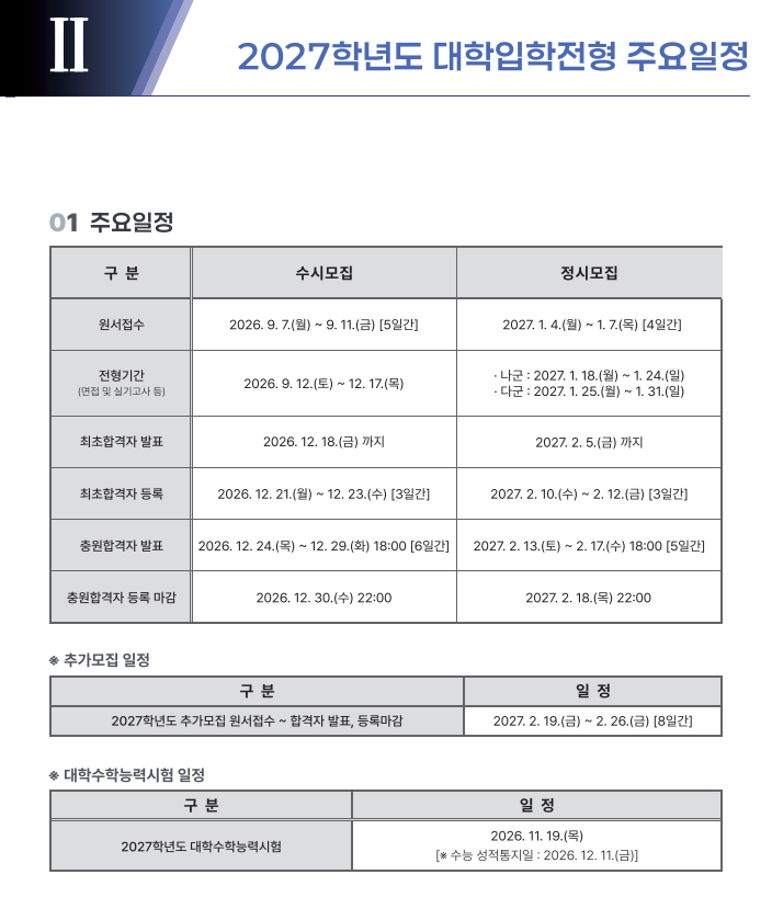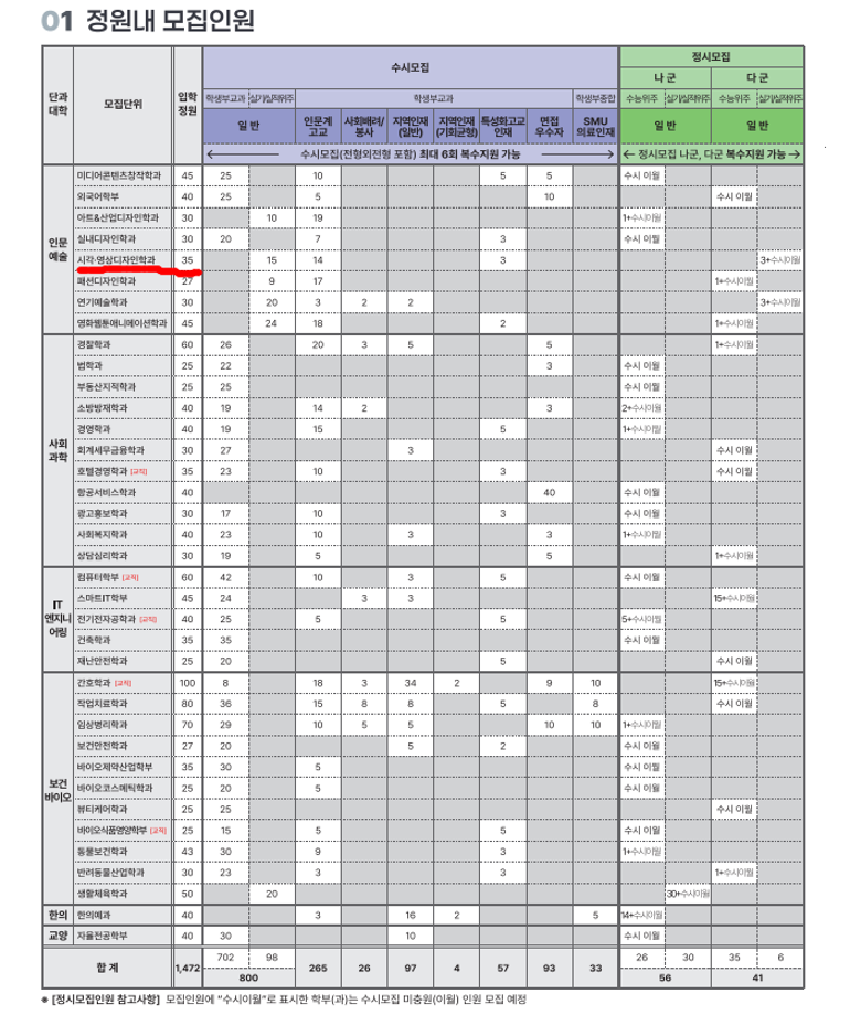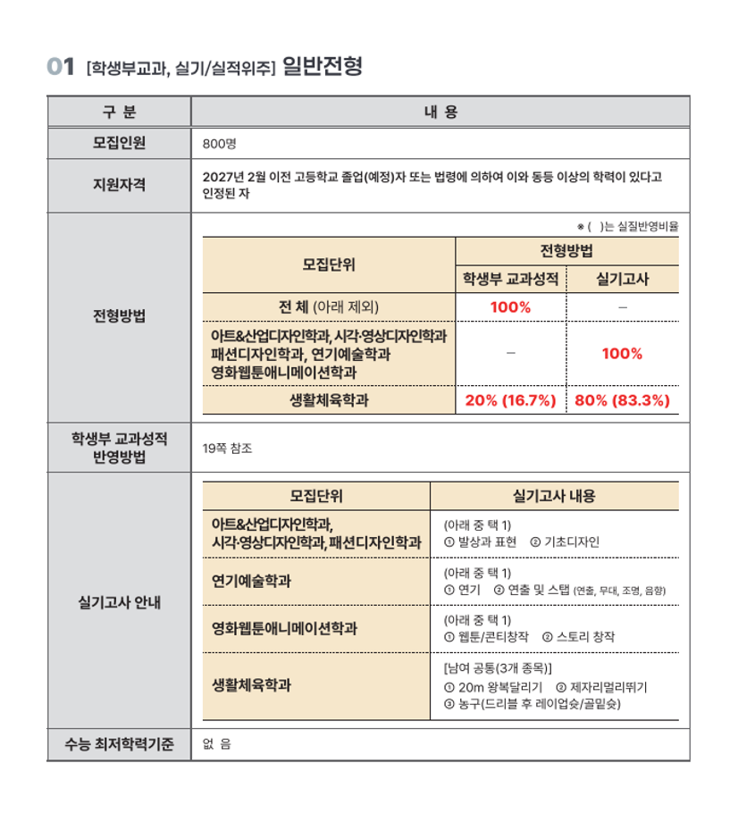 본문 시작 홈으로 입학/취업 학과소개 학과과정 시영소식 입학/취업 AI 학과자랑 SNS소통 홈페이지가이드 입학여기 입학여기 취업지금 전공소개 입학여기 페이스북 트위터 프린트 2027학년도 대학입학전형 시행계획 시각영상디자인학과 48 2026-04-03 본교 2027학년도 대학입학전형 시행계획입니다 첨부파일에 자세한 내용있으니 확인바랍니다~ https://www.semyung.ac.kr/cop/bbs/BBSMSTR_000000000350/selectBoardArticle.do?bbsId=BBSMSTR_000000000350&nttId=472634&bbsTyCode=&bbsAttrbCode=&kind=&mno=sitemap_12&pageIndex=1&searchCnd=&searchWrd= 목록 이전2026학년도 신입생 입학식 안내 만족도조사 만족도 조사 이 페이지에서 제공하는 정보에 대하여 만족하시나요? 매우만족 만족 보통 불만족 매우불만족