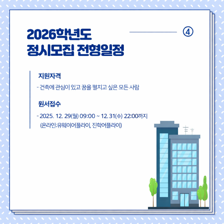본문 시작 홈으로 커뮤니티 학과소개 교수소개 교육과정 학과 행사 및 활동 커뮤니티 홈페이지가이드 열린정보 학과일정 학과공지 채용정보 및 자료 열린정보 포토갤러리 먹거리, 즐길거리 포토갤러리 사진 사진 영상 사진 페이스북 트위터 프린트 사진 영상 [ 건축학과] 2026학년도 정시 원서접수(12.29~31) 건축학과 740 2025-12-30 목록 이전[2026 정시] 모집 안내 다음 2026학년도 정시모집 및 편입학 최초합격자 발표 만족도조사 만족도 조사 이 페이지에서 제공하는 정보에 대하여 만족하시나요? 매우만족 만족 보통 불만족 매우불만족