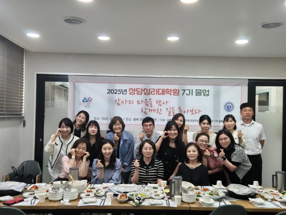 본문 시작 홈으로 대학원 커뮤니티 학부소개 교수소개 교육목표 입학안내 학과 커뮤니티 대학원 커뮤니티 홈페이지가이드 대학원 갤러리 대학원 소식 대학원 일정 대학원 갤러리 대학원 갤러리 페이스북 트위터 프린트 석사과정 사은회 개최 상담심리학과 669 2025-06-19 안녕하십니까 세명대학교 상담심리학과입니다. 7기 석사 과정생분들의 졸업을 기념하여 상담심리학과 교수님들과 함께 식사하는 시간을 가졌습니다! 그동안 수고해주신 교수님들께 꽃다발을 전달하고 수업을 들으며 어려웠던 점, 앞으로의 계획, 감사 인사 등 많은 이야기를 나누며 좋은 시간을 보냈습니다. 졸업을 축하드리며 그동안 고생 많으셨습니다. 졸업 후에도 빛날 여러분들의 앞날을 응원하겠습니다. :) 목록 이전석사과정 현장견학 프로그램 다음 표현예술치료 특강 만족도조사 만족도 조사 이 페이지에서 제공하는 정보에 대하여 만족하시나요? 매우만족 만족 보통 불만족 매우불만족