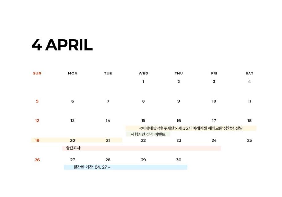 본문 시작 홈으로 학과 커뮤니티 학부소개 교수소개 교육목표 입학안내 학과 커뮤니티 대학원 커뮤니티 홈페이지가이드 학과 갤러리 학과소식 학사일정 학과 갤러리 학과 갤러리 페이스북 트위터 프린트 4월 학사일정 상담심리학과 2 2026-04-17 안녕하세요 세명대학교 상담심리학과입니다! 4월 학사일정 안내드립니다. 4/20(월)~24(금)은 중간고사 기간입니다. 노력한 만큼 좋은 결과 있길 바랍니다 :) 목록 이전Shine-up 동아리 봉사 활동 다음 심리극과 연극치료 학술특강 만족도조사 만족도 조사 이 페이지에서 제공하는 정보에 대하여 만족하시나요? 매우만족 만족 보통 불만족 매우불만족