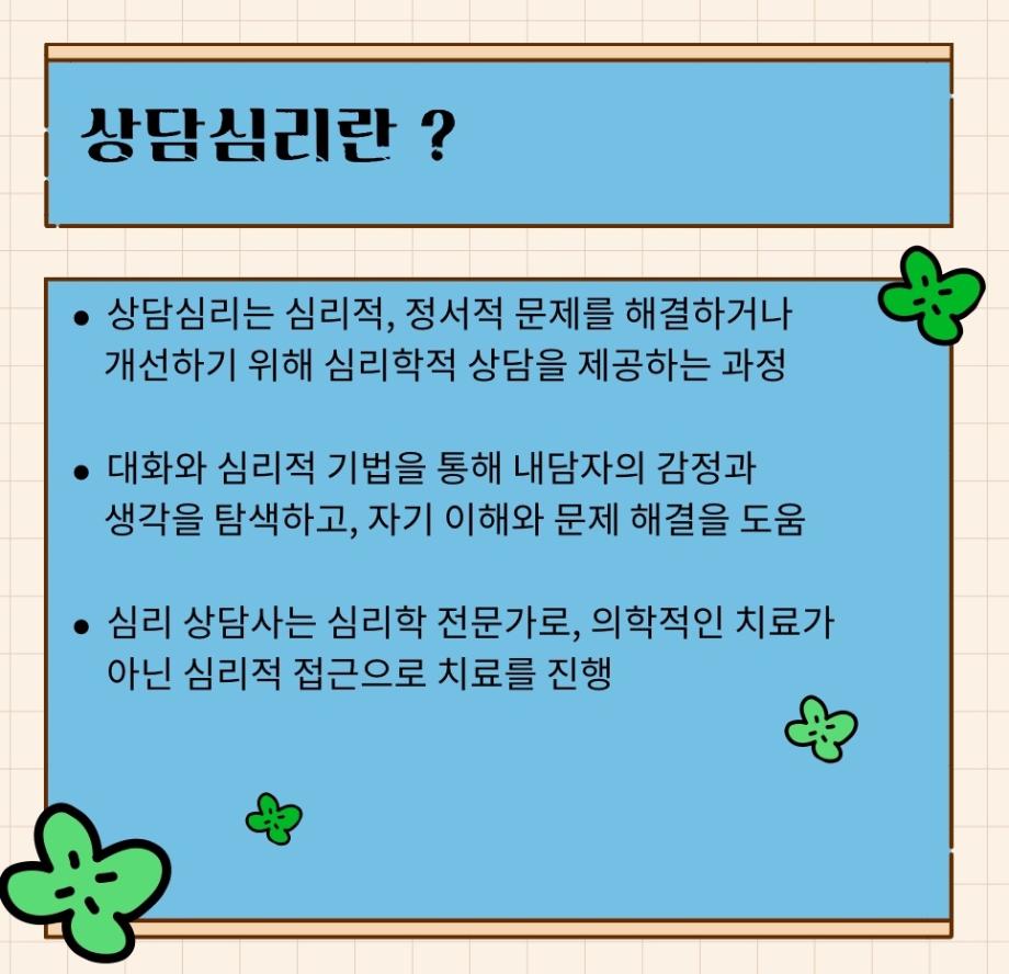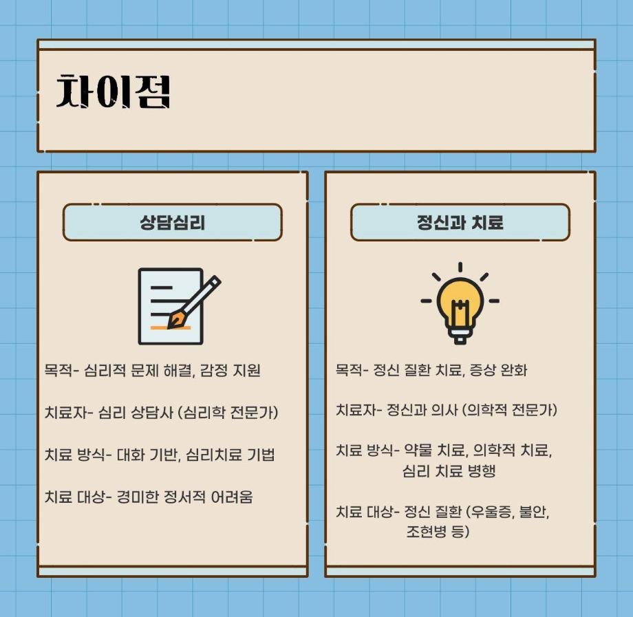 본문 시작 홈으로 학과 커뮤니티 학부소개 교수소개 교육목표 입학안내 학과 커뮤니티 대학원 커뮤니티 홈페이지가이드 학과 갤러리 학과소식 학사일정 학과 갤러리 학과 갤러리 페이스북 트위터 프린트 상담심리와 정신과 치료의 차이점을 알려줘! 상담심리학과 1436 2025-01-08 목록 이전석·박·학사 연합 전공특강 (동물매개치료) 다음 감정 표현의 중요성 만족도조사 만족도 조사 이 페이지에서 제공하는 정보에 대하여 만족하시나요? 매우만족 만족 보통 불만족 매우불만족