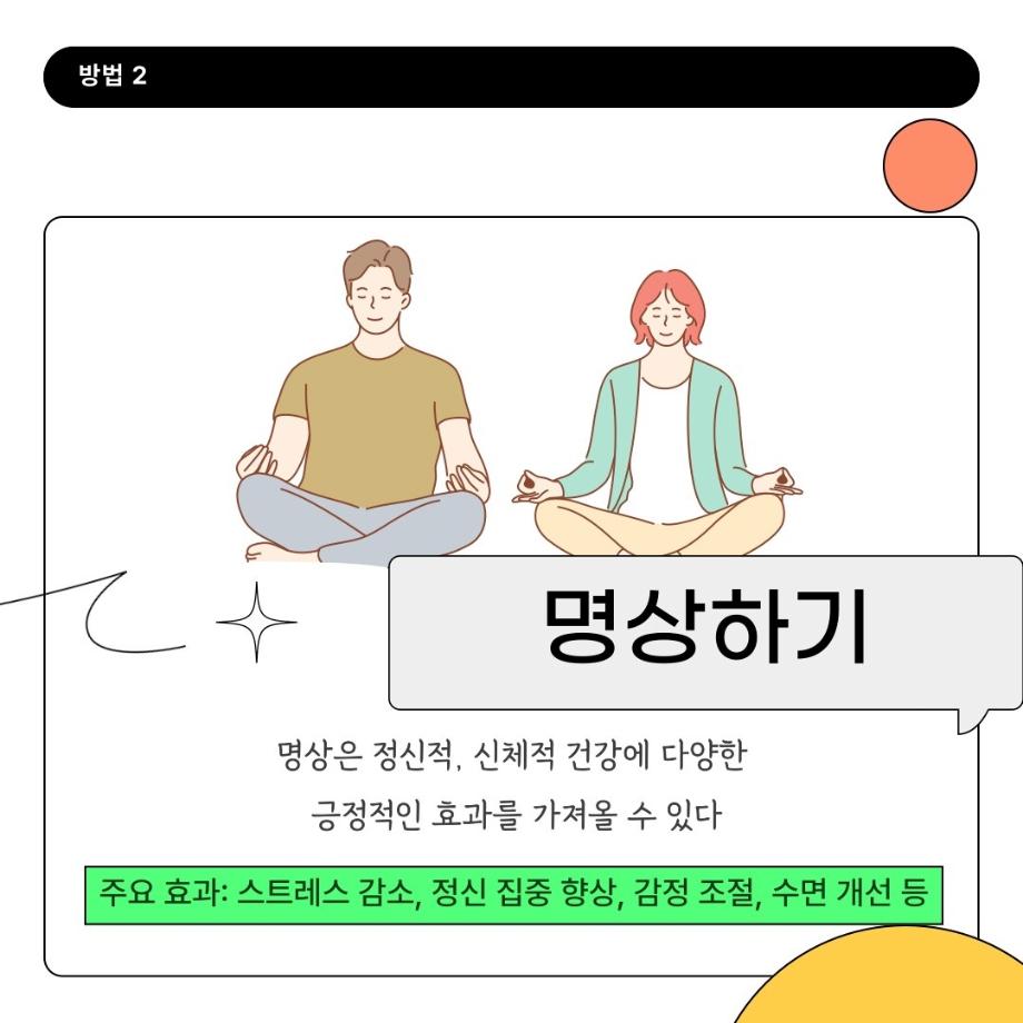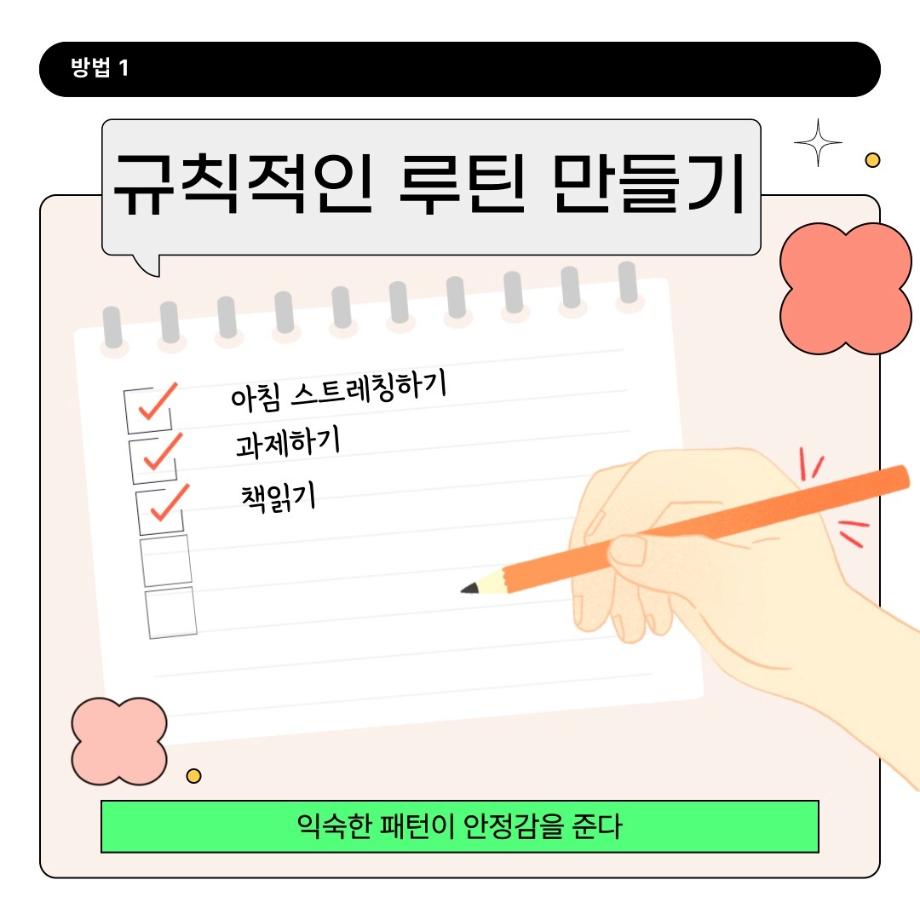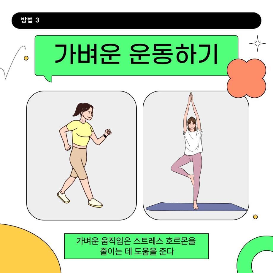본문 시작 홈으로 학과 커뮤니티 학부소개 교수소개 교육목표 입학안내 학과 커뮤니티 대학원 커뮤니티 홈페이지가이드 학과 갤러리 학과소식 학사일정 학과 갤러리 학과 갤러리 페이스북 트위터 프린트 스트레스를 줄이는 5가지 방법 상담심리학과 1690 2025-02-12 1. 규칙적인 루틴 만들기 2. 명상하기 3. 가벼운 운동하기 4. 감정 기록하기 5. 취미 활동 하기 스트레스는 이렇게 간단한 방법으로도 줄일 수 있습니다. 이 방법 외에도 여러분에게 맞는 방법을 찾아 스트레스를 조절해 보세요! 목록 이전2월 학사일정 다음 2025 신입생 꿈설계학기 만족도조사 만족도 조사 이 페이지에서 제공하는 정보에 대하여 만족하시나요? 매우만족 만족 보통 불만족 매우불만족