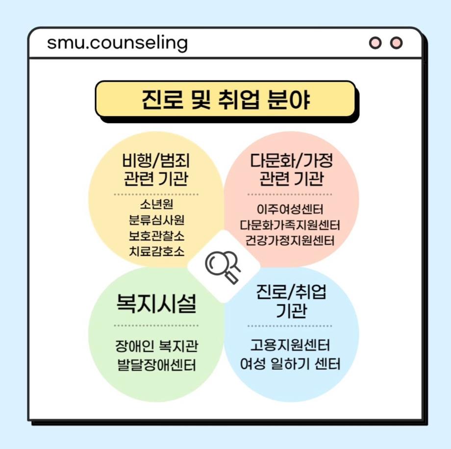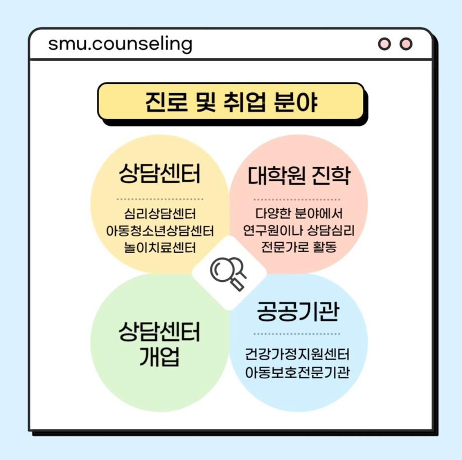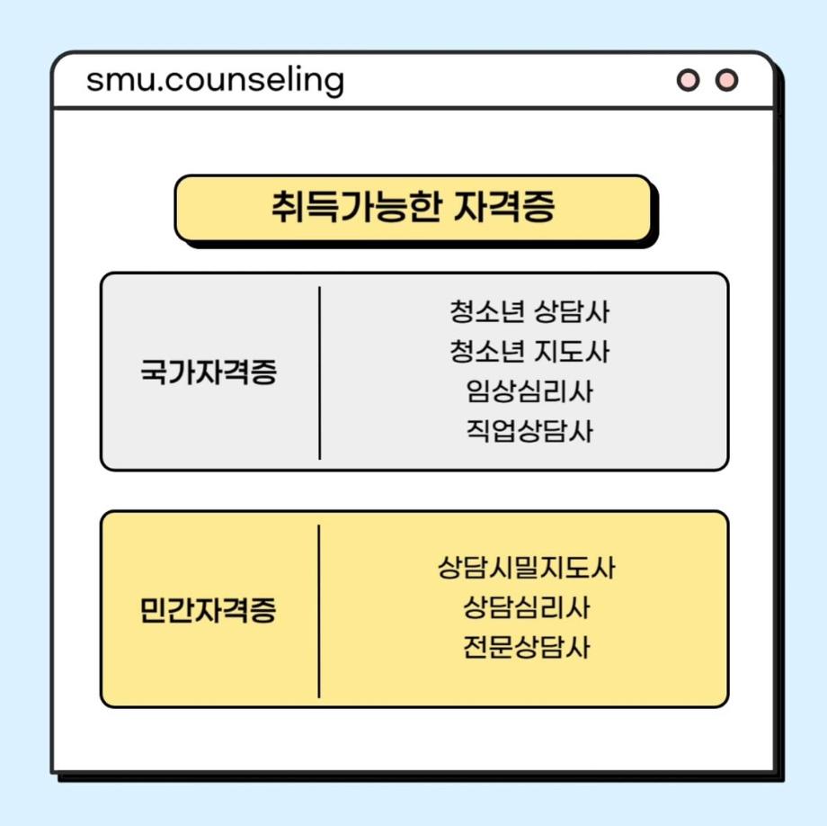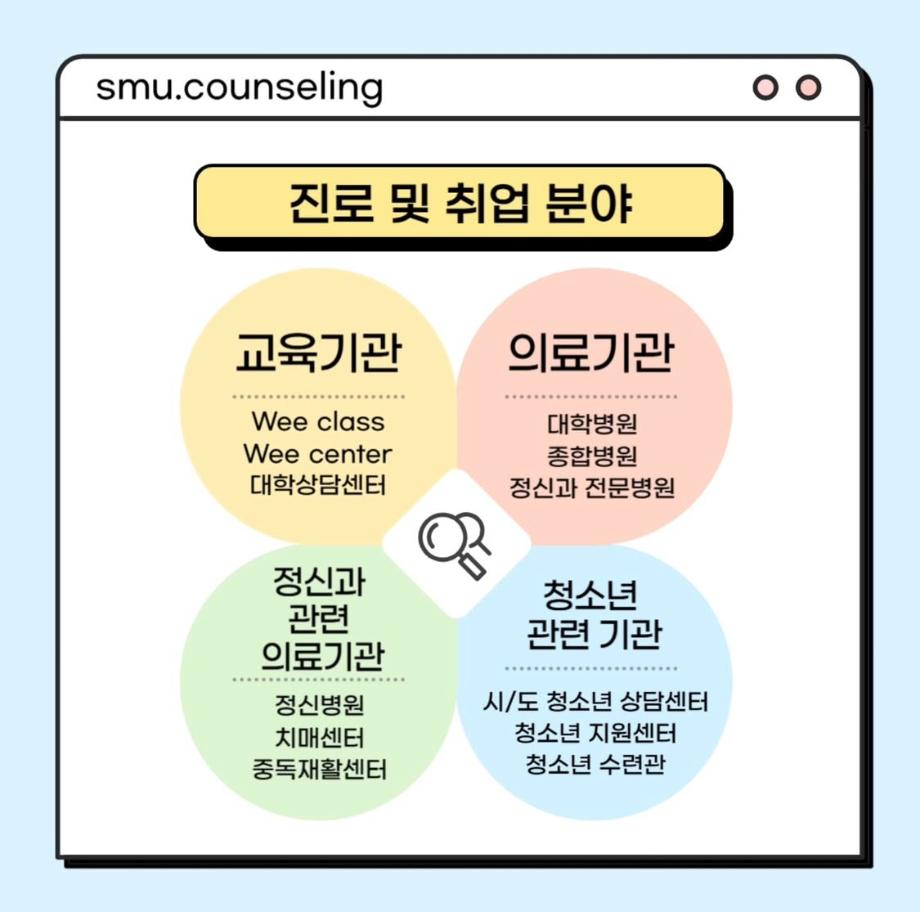 본문 시작 홈으로 학과 커뮤니티 학부소개 교수소개 교육목표 입학안내 학과 커뮤니티 대학원 커뮤니티 홈페이지가이드 학과 갤러리 학과소식 학사일정 학과 갤러리 학과 갤러리 페이스북 트위터 프린트 자격증&진로 소개 상담심리학과 767 2025-07-30 안녕하십니까 세명대학교 상담심리학과입니다! 오늘은 상담사가 되기 위해 필요한 자격증, 취업 분야를 소개해드리려고 합니다. 상담심리학과 졸업 후에는 교육기관, 의료기관, 복지시설 등 다양한 분야에서 활동할 수 있습니다 :) 목록 이전[현직자 인터뷰] 평창군청소년상담복지센터 다음 [현직자 인터뷰] 육군 상담사 만족도조사 만족도 조사 이 페이지에서 제공하는 정보에 대하여 만족하시나요? 매우만족 만족 보통 불만족 매우불만족