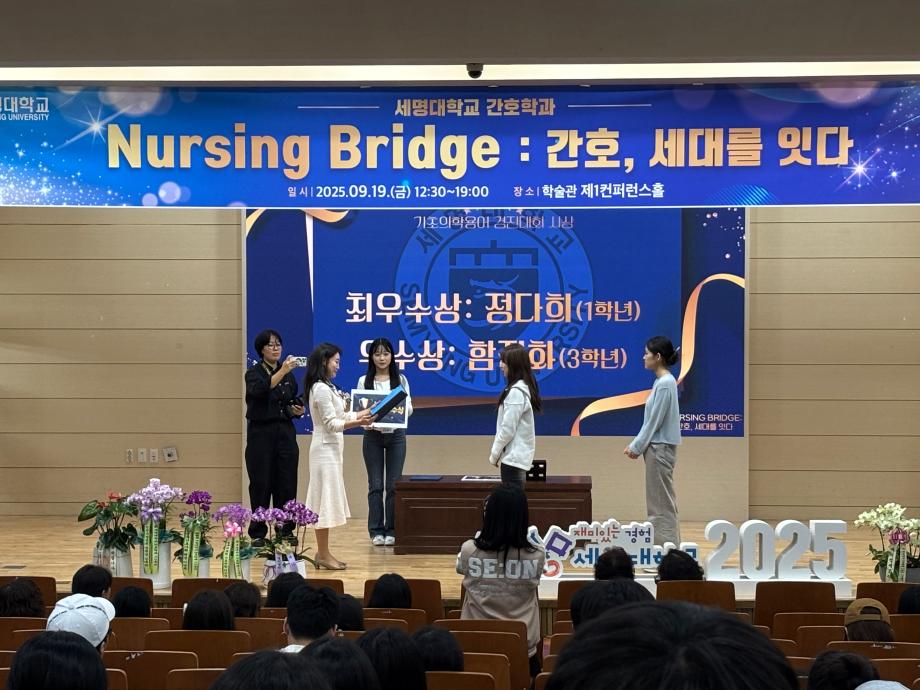 본문 시작 홈으로 학과특성화 사업 학과소개 교수소개 교육과정 학과소식 학과특성화 사업 커뮤니티 홈페이지가이드 2025년 2026년 2025년 2024년 2023년 2022년 2021년 2020년 2019년 2018년 2017년 2016년 2015년 2014년 2025년 페이스북 트위터 프린트 🎉 세명대학교 간호학과 30주년 기념행사 🎉 Nursing Bridge: 간호, 세대를 잇다 간호학과 577 2025-09-24 세명대학교 간호학과가 개설 30주년을 맞아, 지난 세월의 발자취를 돌아보고 미래 간호를 함께 그려보는 뜻깊은 시간을 가졌습니다. 이번 행사에는 권동현 총장님, 신경림 대한간호협회장님, 정승교 명예교수님을 비롯해, 수많은 졸업생과 내외빈 여러분이 함께해 자리를 빛내주셨습니다. 과거와 현재, 그리고 미래의 간호를 잇는 ‘Nursing Bridge’ 그 감동의 순간들을 공유드립니다. 목록 이전핵심간호술 졸업인증제 프로그램 다음 2025학년도 기초실습역량향상프로그램 (카데바 실습) 담당부서 : 간호학과 담당자 : - 연락처 : 043-649-1357 최종수정일 : 2024-10-26 만족도조사 만족도 조사 이 페이지에서 제공하는 정보에 대하여 만족하시나요? 매우만족 만족 보통 불만족 매우불만족